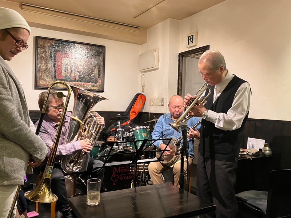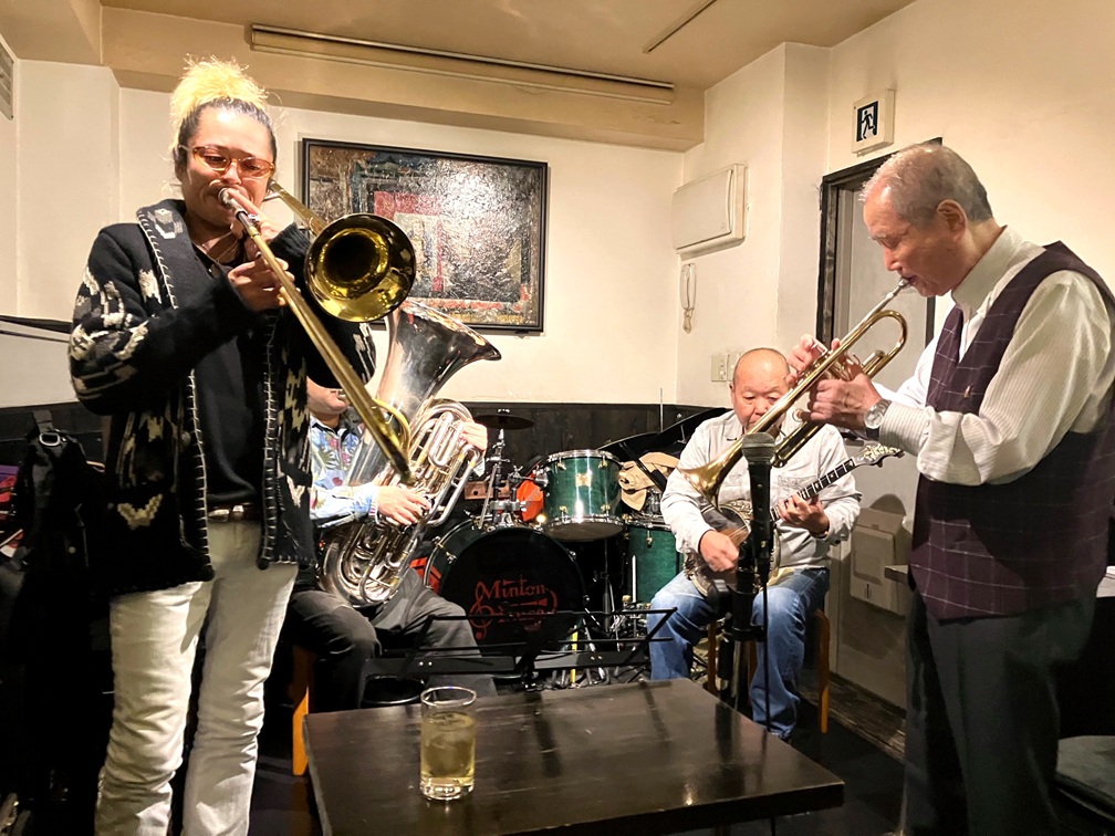中川 喜弘(tp)、薗田 勉慶(tb) 家中 勉(tu)、ジャック天野(bj)
