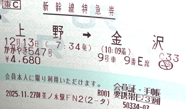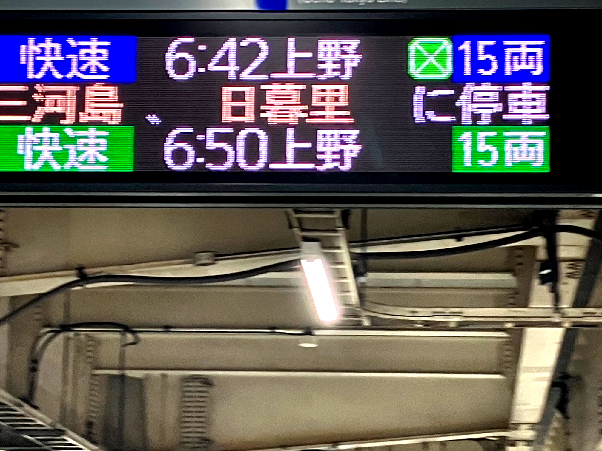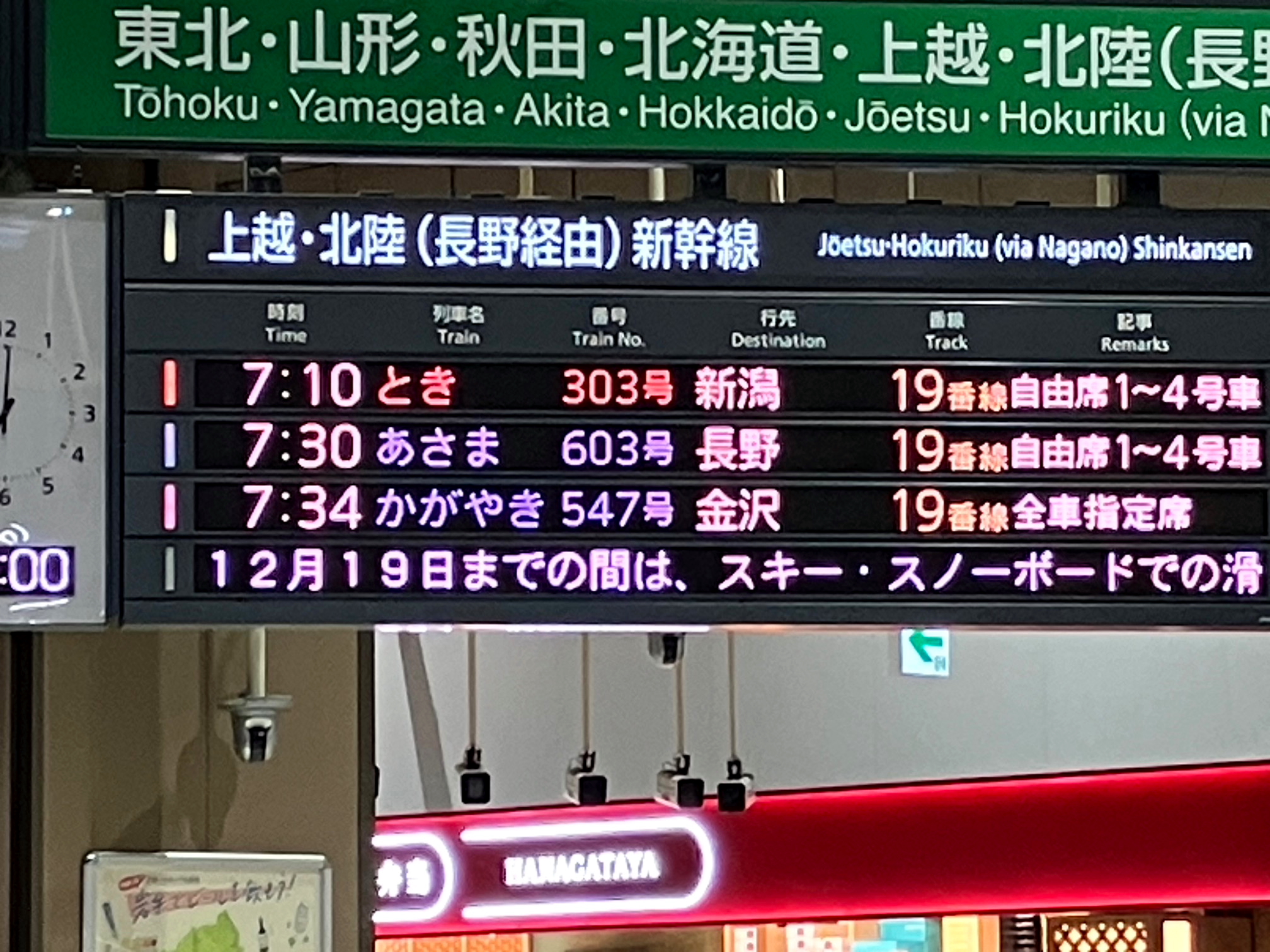 北千住 6:42 常磐線快速で上野へ、 上野 7:34発かがやき547号 で出発
