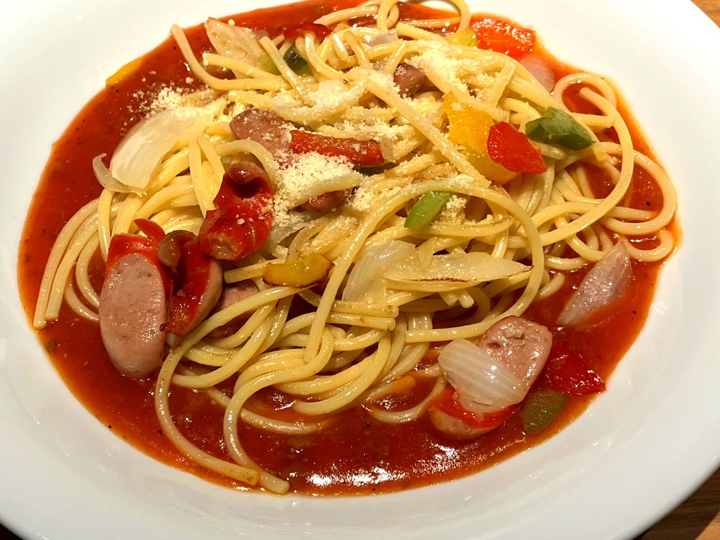 名古屋市発祥のスパゲッティ料理 茹でた太麺のスパゲッティをラードや植物油で炒め、中華料理の餡のような粘性とコクのある辛味の効いたソースを かけたものです。